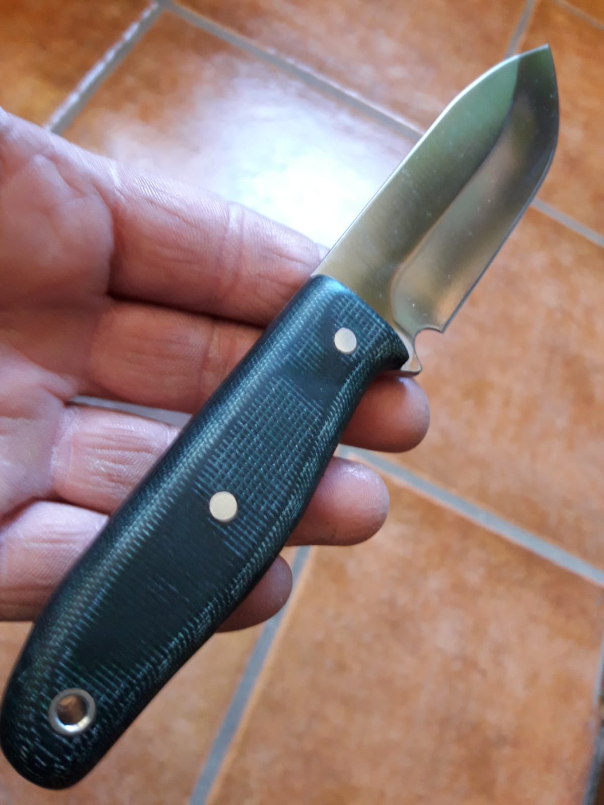 Cuchillo MT bushcraft en acero Bohler N690Co, cachas de micarta verde y funda de cuero marrón. Hoja de 10 cm, 20 cm. total. 4 m/m de grosor, hoja enteriza.