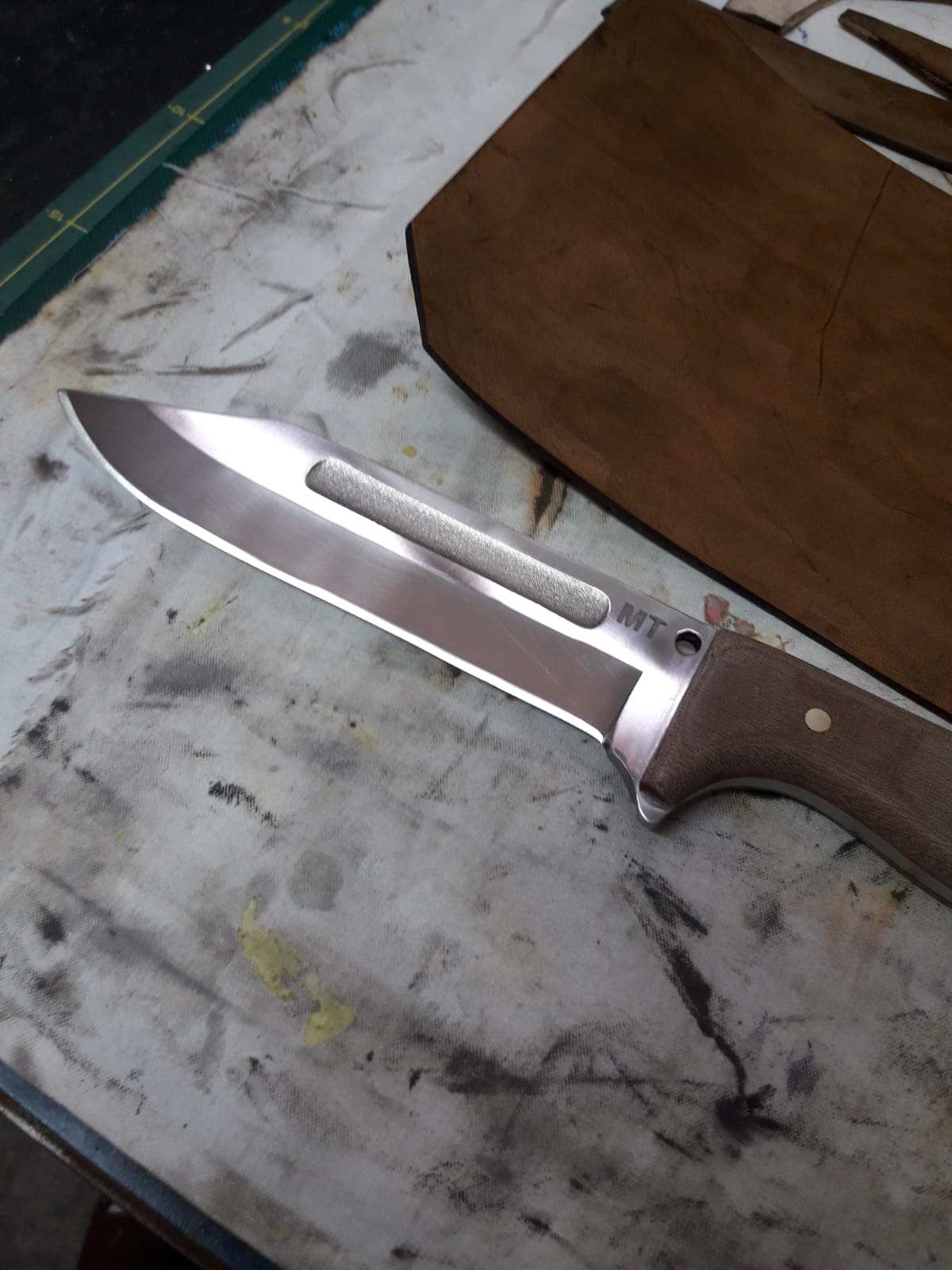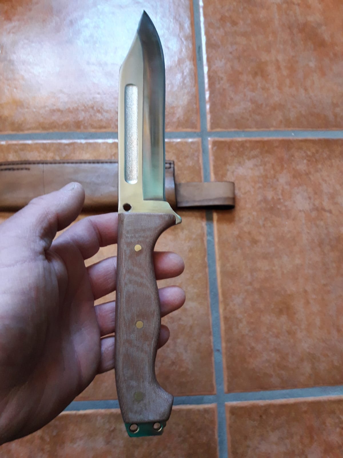 Cuchillo de combate MT Centurión, tipo "bowie" de 16 cm. de hoja con sangradera. Construcción enteriza con cachas de micarta marrón. Funda de cuero marrón. Acero MoVa. 90 euros con envío incluido a la península (NO ENVIO A CANARIAS/ CEUTA/MELILLA).