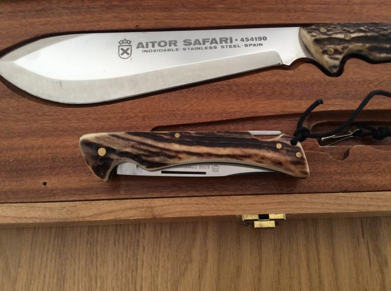 Pongo a la venta este Pack Aitor con estuche de madera y en su interior un cuchillo Aitor Safari y una navaja Aitor Commando. Ambos con mangos de asta de ciervo. También lleva una funda de cuero negro acharolado. Todo es original y en un estado buenísimo dado que es un pack que se vendía en los años 80 según he podido ver por internet y hay ya muy pocas opciones de conseguir estos packs de esta gran marca de aquella década. Tiene muy poco uso y lleva años en el trastero de mi padre y estoy seguro que algún coleccionista le dará un mejor uso.