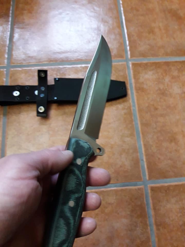 Cuchillo de monte artesanal realizado por Manuel de la Torre, acero MOVA, 16 cm de hoja enteriza, cachas de micarta verde y funda de material sintético. 110 euros envío incluido a la península.