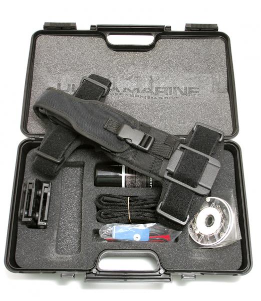 Cuchillo de buceo YUltramarine de Extrema Ratio. Hoja de acero inoxidable Böhler N690 de 150 mm de longitud y 63 de espesor. Filo liso y con sierra de rasgar. Mango de poliamida. Doble funda semirrígida de cordura y poliamida rígida compatible con molle. Peso del cuchillo 375 g. Incluye doble tek-lok, repuestos, aceite de mantenimiento, estuche protector.