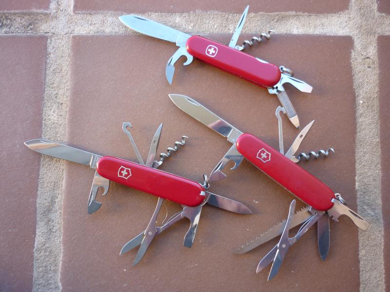 Son dos Victorinox, Huntsman y Climber, y una Wenger Delemont (como nueva) ya descatalogada y dificil de conseguir en este estado.