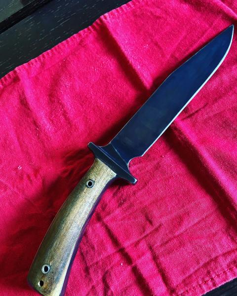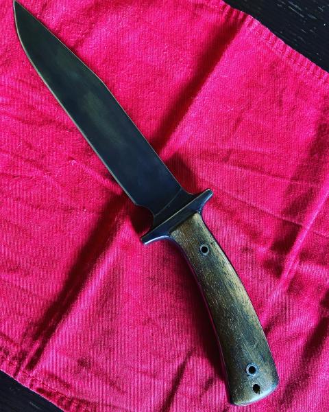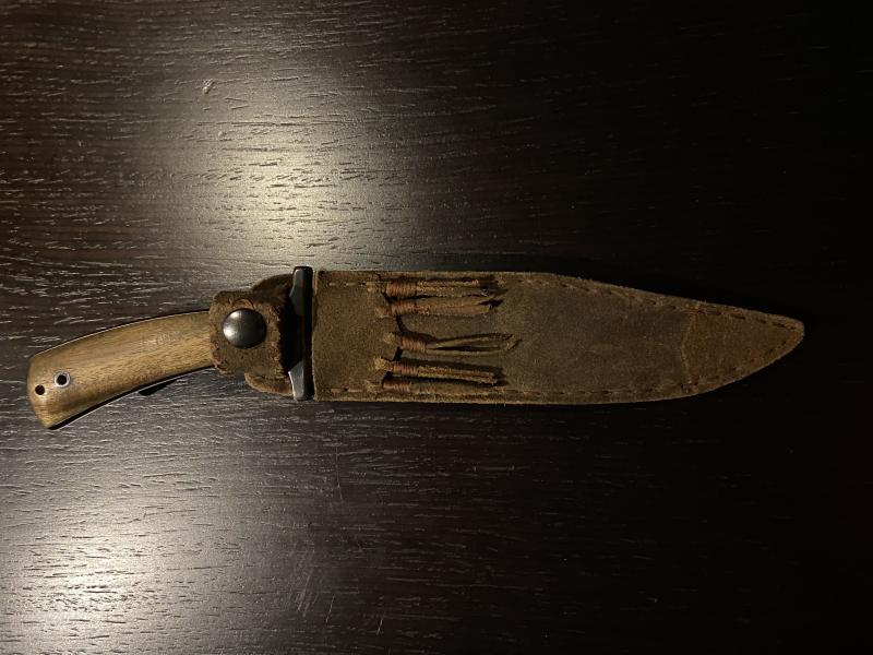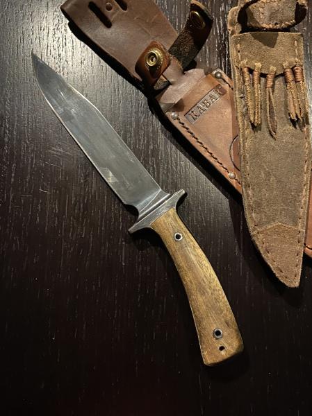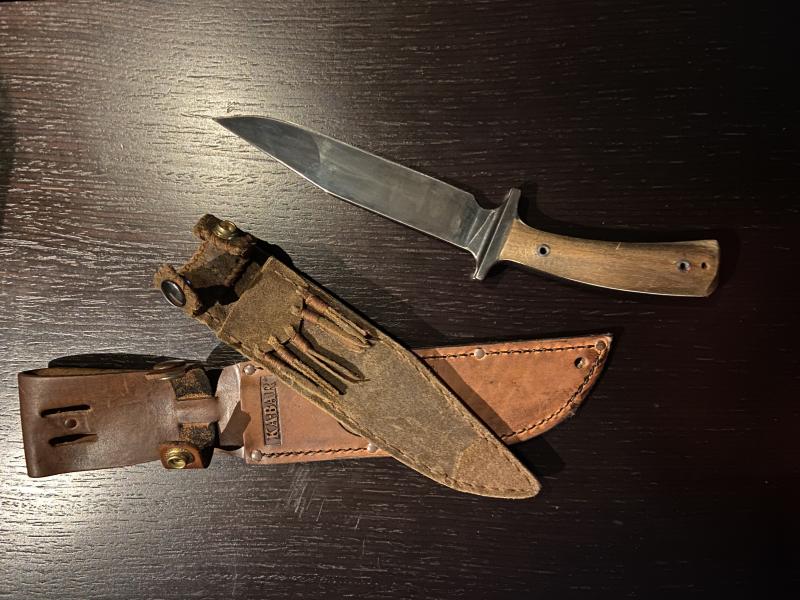 Tuneado por su anterior dueño (compañero del foro). Hoja pavonada y cachas en teka, creo. La funda “Comanchera” también hecha por el anterior propietario. Le compré una de Ka-bar que tampoco le va mal del todo.