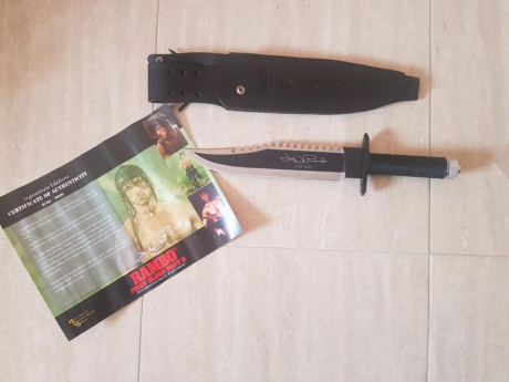 Una serie limitada del cuchillo RAMBO II con su certificado. Funda de cuero y en el pomo tiene todo los utilies.