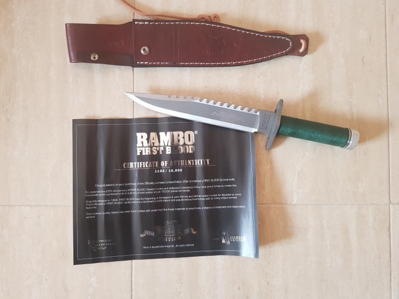 Cuchillo Rambo especial 25 aniversario. Funda cuero y certificado. En el mango están todos los utiles.