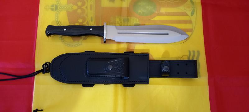 Hoja de acero Mova ( molibdeno y vanadio) enterizado gran dimensión y anchura de hoja cachas de micarta negras y funda de cuero de calidad.
