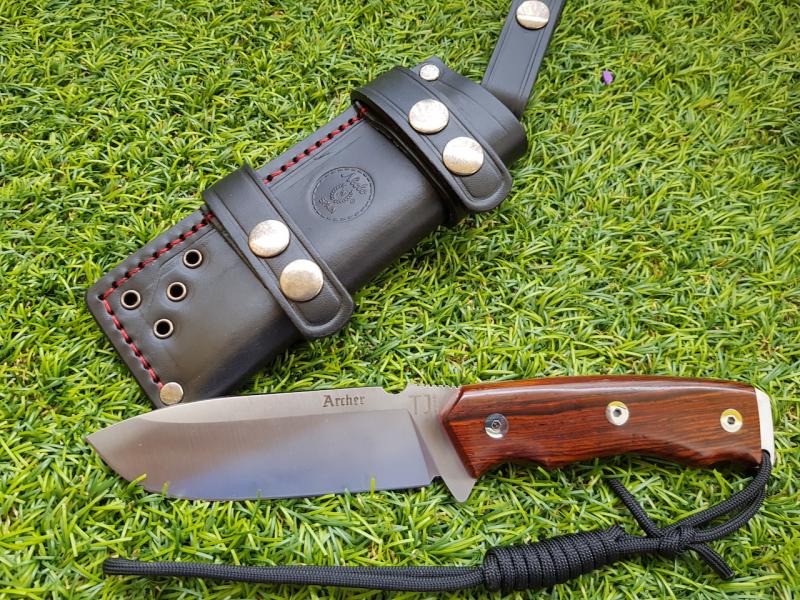 NIETO ARCHER - 80€ - El modelo Archer está fabricado en una hoja enteriza de acero inoxidable MoVa 1.4116. con muesca en el lomo para raspar la barra de pedernal (fire steel). Empuñadura en madera de cocobolo con separadores de fibra de color rojo. Incluye funda de cuero. Totalmente nuevo