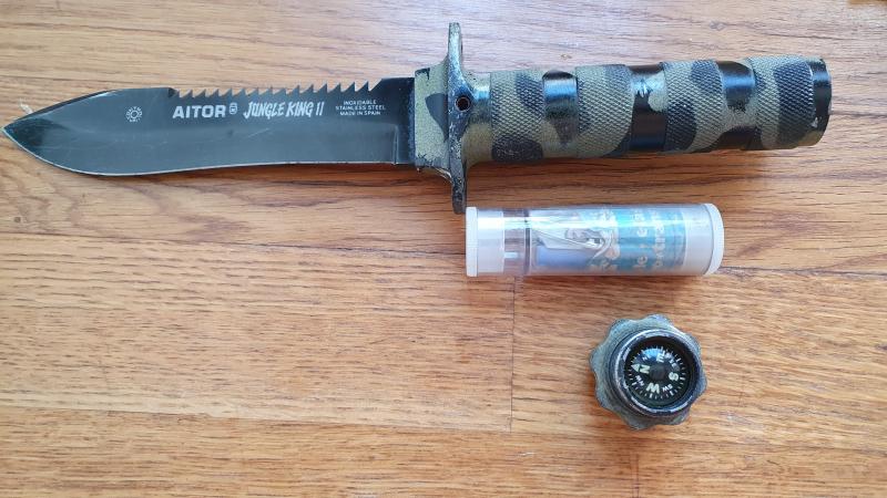 El primero es el Jungle King II color camuflaje. Lo compré tal y como está en un mercadillo hace años y nunca lo he usado. Tiene su cápsula de supervivencia sin abrir.