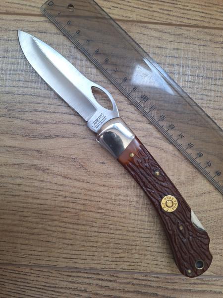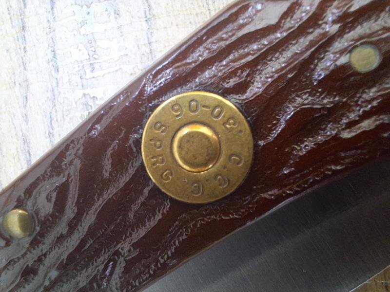 Navaja de factura americana marca CAMILLUS con cachas de hueso tallado y vaina del 30/06 incrustada en ambos lados.