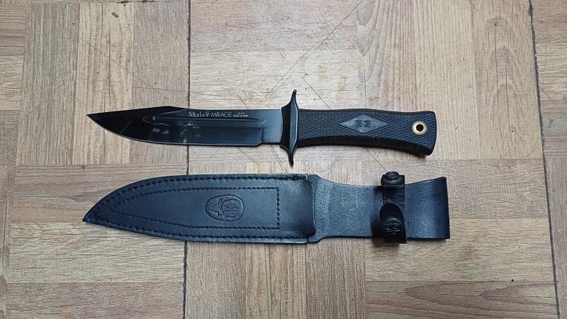 --Cuchillo Muela Mirage 18, con cachas engomadas negras, hoja tambien negra y funda de cuero negra. Este es el modelo comercial........50 euros.