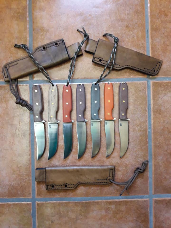 Hola Doc, son estos: de izquierda a derecha micarta marrón, g-10 naranja, micarta verde canvas, micarta marrón, micarta verde, micarta naranja y micarta marrón. Todos se pueden pavonar y tienen funda de cuero multiposición y paracord 550.