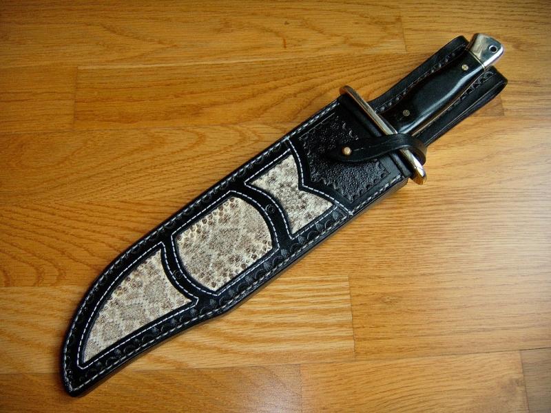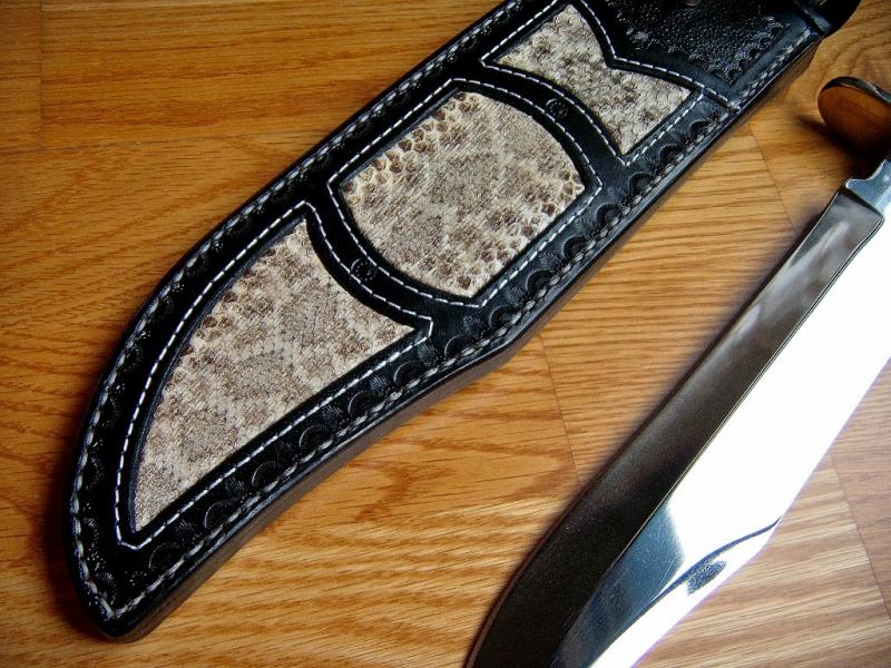La funda es artesanal, hecha a medida con insertos de piel de serpiente de cascabel en tres ventanas (la de arriba cerca de la embocadura), con una falsa solapa que se remata con una vuelta de potro.