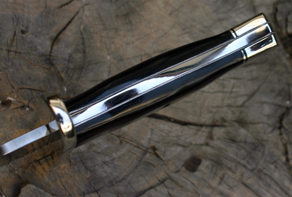 La empuñadura es de madera de ébano, tiene un pulido fino y está tratada con ceras impermeabilizantes. Los pasadores (2) son de tipo pin mosaico. La guarda y el pomo son de alpaca pulida a espejo, con agujero para cordón fiador en el pomo. Tiene separadores de fibra vulcanizada negra entre pomo, guarda y cachas; y separadores de fibra vulcanizada blanca entre cachas y espiga.