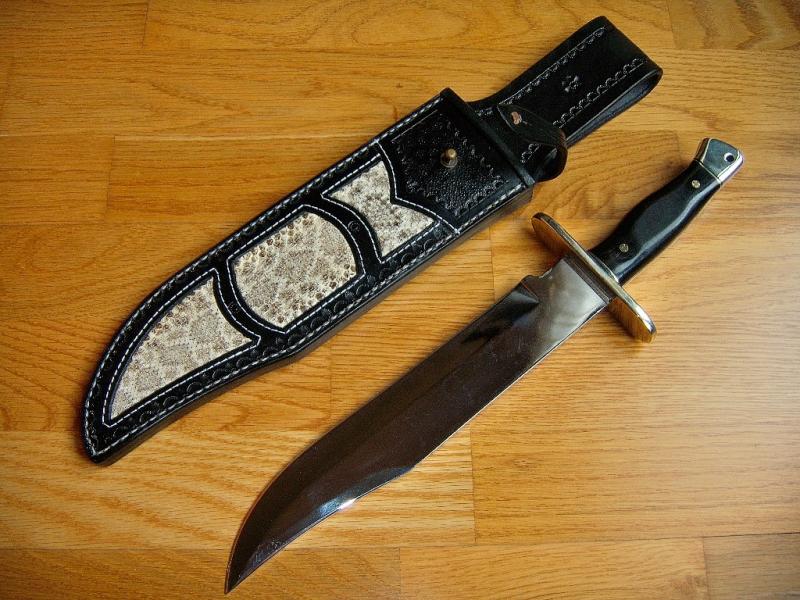 Vendo cuchillo Bowie hecho por encargo, sin uso. Tiene una longitud total de 38 cm., la hoja mide 25,5 cm. (incluido el recazo), y tiene un grosor de 4,5 mm. El peso es aproximadamente de 560 gr. (sin funda). La hoja está pulida a espejo, tiene un vaciado cóncavo y un falso contrafilo.