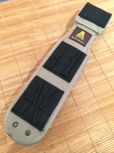 Funda táctica de gruesa cordura, con sistema M.O.L.L.E. y sujeción a cinto, con doble cierre automático más velcro para la sujeción del cuchillo KA-BAR 5600, y dos departamenteos frontales. Uno para el KA-BAR Monoblock, y el otro, de generosa capacidad, para transporte de multi-herramientas, navaja adicional, utensilios de supervivencia, o rollo de paracord.