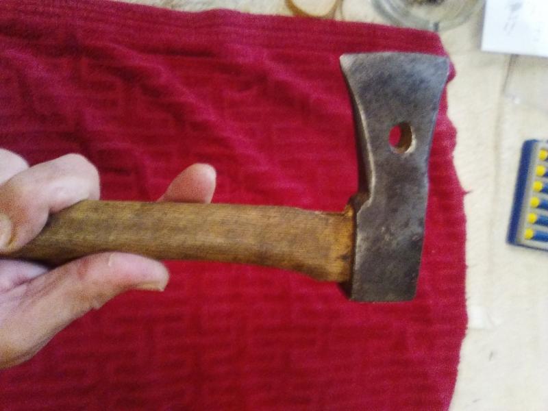 Buenas otra mas del cajón , es una hacha pequeñita pero de buen acero la compre en Chequia hace ya unos añitos, cuando abrieron las fronteras en el 92, no tiene marca, y parace que el mango no es el suyo cosa de estos países y sus soluciones con clavos de herradura en vez del tascon.