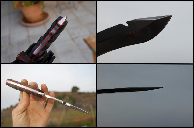 Cudeman JJ sk1 Böhler n695, modificado para quitar la dactilera del pulgar y hacer un corta-alambres (se cuidó la temperatura para no fastidiar el tratamiento térmico de la hoja). Cachas de micarta rebajadas para adelgazarlas, como se ve en las fotos. Está usado, reafilado y pulido y va sin funda original. Lleva una casera de cuero con Tec-Lock para porte horizontal y hueco para ferrocerio. Cuchillo solo: 20e. Con funda: 25e. Con funda y ferrocerio: 30e.