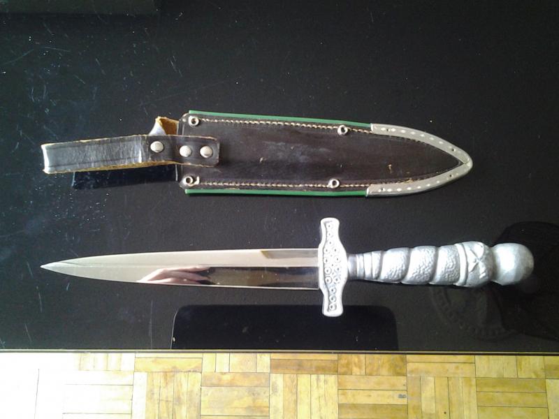 Vendo daga de Solingen con marcaje Rehwappen. La hoja mide 15 cm con un increíble grosor de 7 mm, a 4 mesas. Lleva vaina de cuero original con refuerzos. El pomo es un cráneo con tibias cruzadas, al dorso hojas de roble y unas guardas que evocan el martillo de Thor. Su anterior propietario me contó que un club de juventudes nacionalsocialistas lo encargo como edición limitada tras la 2gm y por tanto tuvo que cambiar los símbolos habituales anteriores y poner otros que evocaran el pasado sin levantar ampollas en el nuevo ambiente post bélico. La daga tiene una calidad excepcional y su estado es magnifico. El precio incluye el envio por ASMGO, también se puede entregar en mano en Madrid. Gracias por vuestro interes...