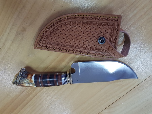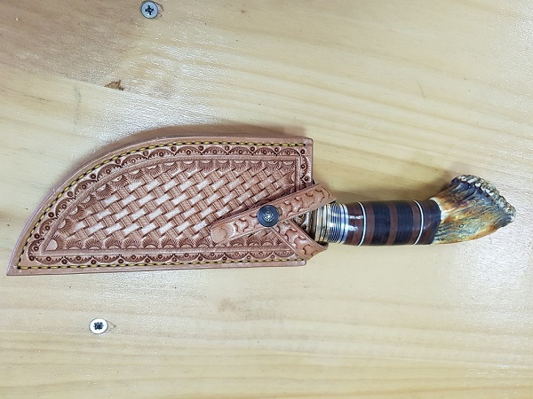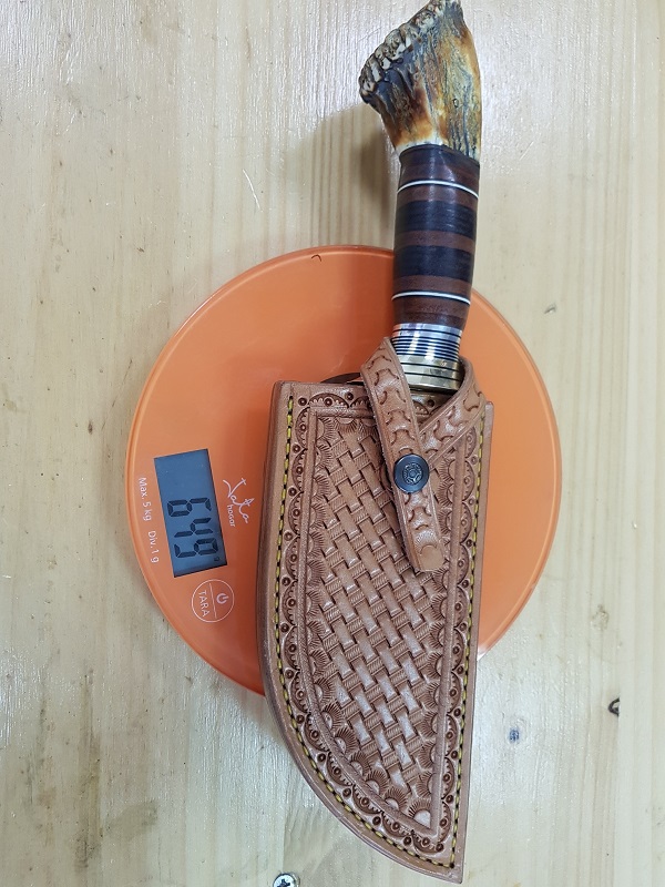 cabo con latón, aluminio, fibra vulcanizada, cuero y roseta de ciervo.Espiga con pasador de latón