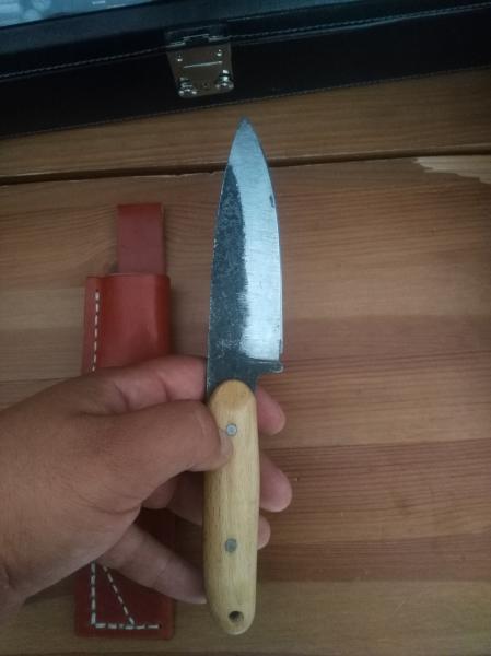 cuchillo forjado en acero al carbono 9260 mango de madera de haya medidas 11cm de hoja 10 cm de mango 3,5mm de grosor de hoja precio 50 euros