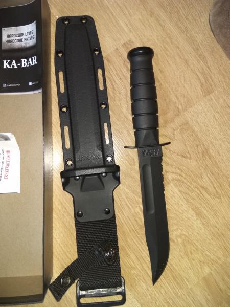 Buenas tardes, se vende cuchillo Ka-Bar modelo 1214 con hoja de acero carbono 1095, con filo parcialmente serrado, longitud de la hoja 17,78, longitud total 30,48. Hecho en USA. Empuñadura sintética antideslizante con pomo de acero. Funda de Kydex con cierre a presión y cierre de clip.Totalmente nuevo, en su caja