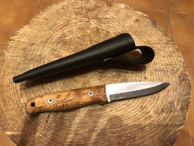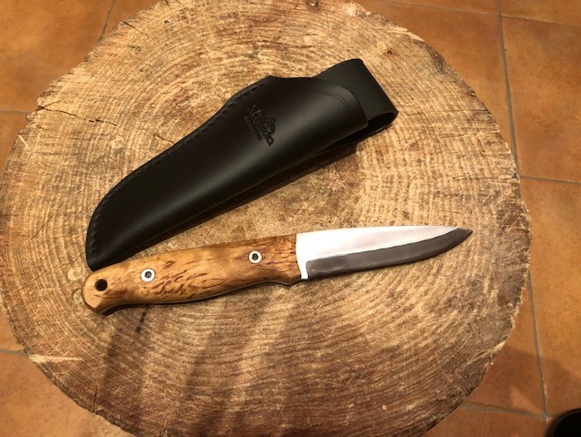 Acero al carbono, cachas abedul rizado, vaciado scandi.