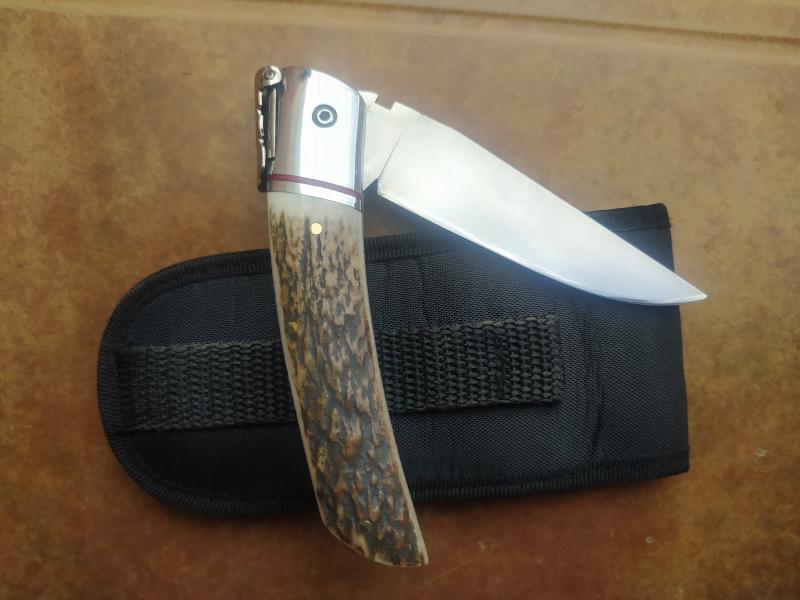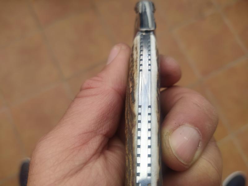 Vendo navaja Muela artesanal modelo NPQ-8A, con cachas de ciervo y lomo decorado.