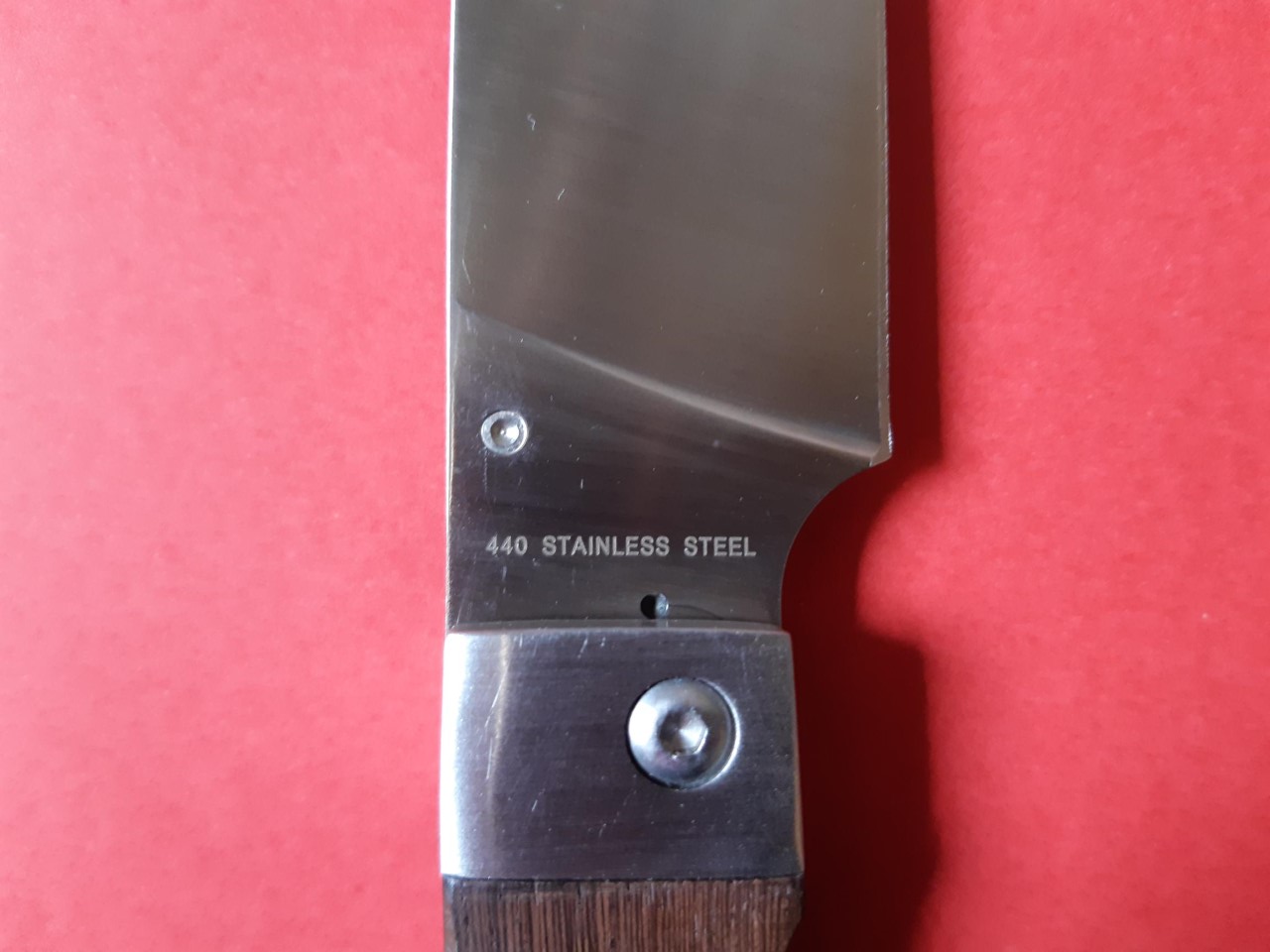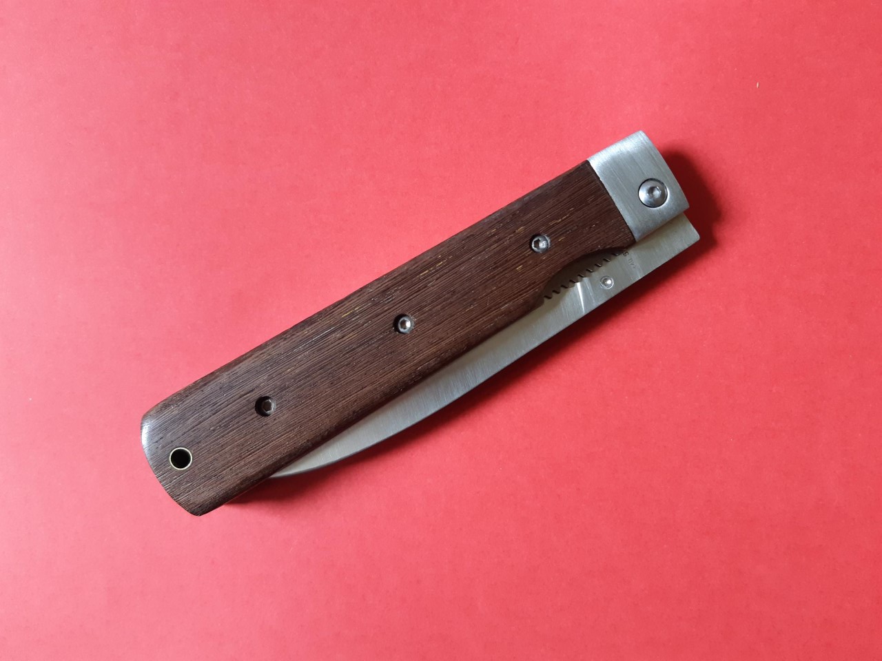 Gran hoja ancha de algo más de 11 cm de largo en acero inox 440, bloqueo lateral, orificio para pasar un fiador, cachas de madera tropical, posiblemente teca. Ideal para apretarse unas chuletas o un asadito de tira este verano.