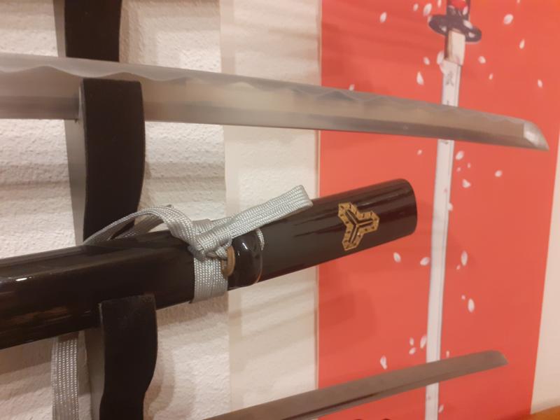Forjada a mano en acero 1065 templado al carbono, MUY afilada, la hoja viene grabada con el Demonio característico; el encordado del tsuka es trenzado negro sobre piel de Raya y vaina de madera lacada en negro, con el grabado del trébol, tsuka característico de Hattori Hanzo.