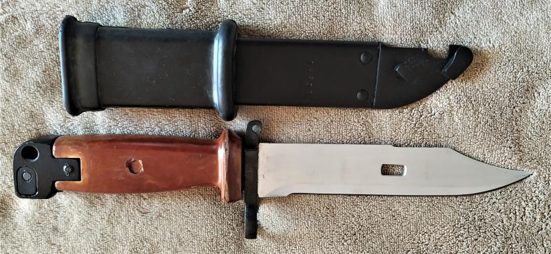 Bayoneta AK tipo 2, creo que soviética (marcajes romboidales), números coincidentes. 50€.