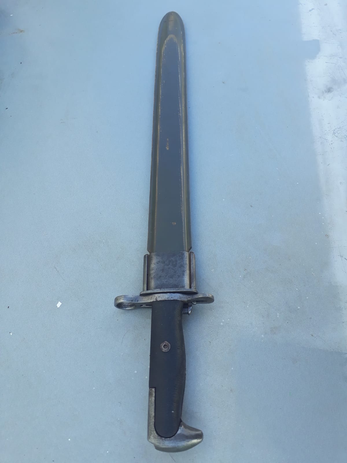 vendo bayoneta modelo largo de la bayoneta utilizada por la marina de los eeuu en la segunda guerra mundial. fechada en 1942 y marcaje en funda mk1 USN . modelo original sin recortar. totalmente original.