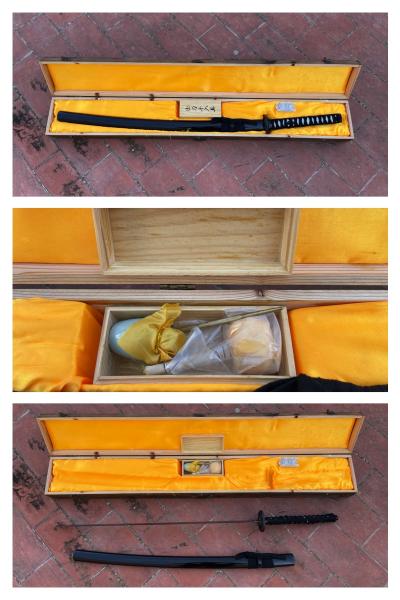 • Saya (vaina) de madera con lacado negro. Tsuka (empuñadura) en piel de raya con trenzado negro y Tsuba (guardamanos) de fundición.