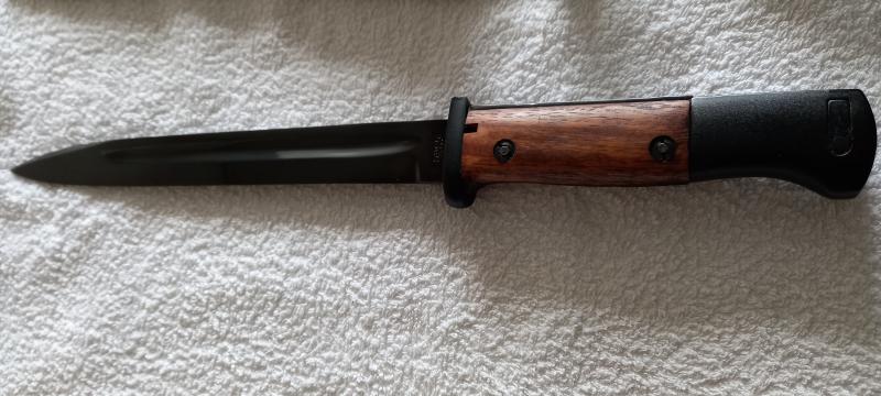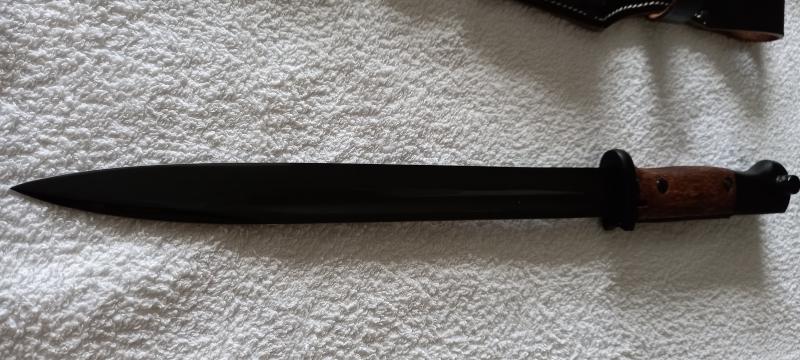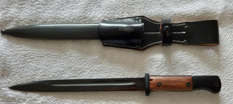 Bayoneta Mauser K98 replica fabricada actualmente de calidad en acero al carbono, lleva tahali de cuero ideal para coleccionista o renactor su estado es impecable sin marcas de uso y se adapta al fusil original en su carril porta bayoneta