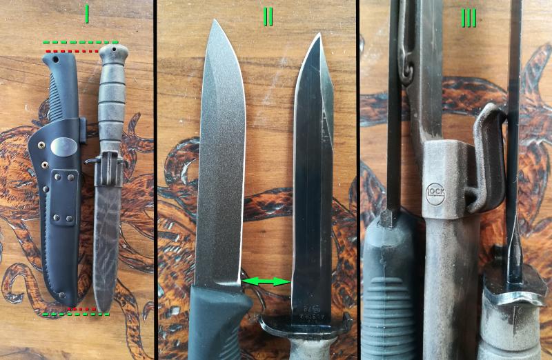 En cuanto al tamaño, como se ve en la siguiente serie de fotos y comparado con un Glock, el M95 es algo más compacto (foto I). Pero, aunque la hoja del Glock es algo más larga, el recorrido de filo es mayor en el Peltonen que en el Glock (II y III). El Peltonen también tiene más ancho de pala.