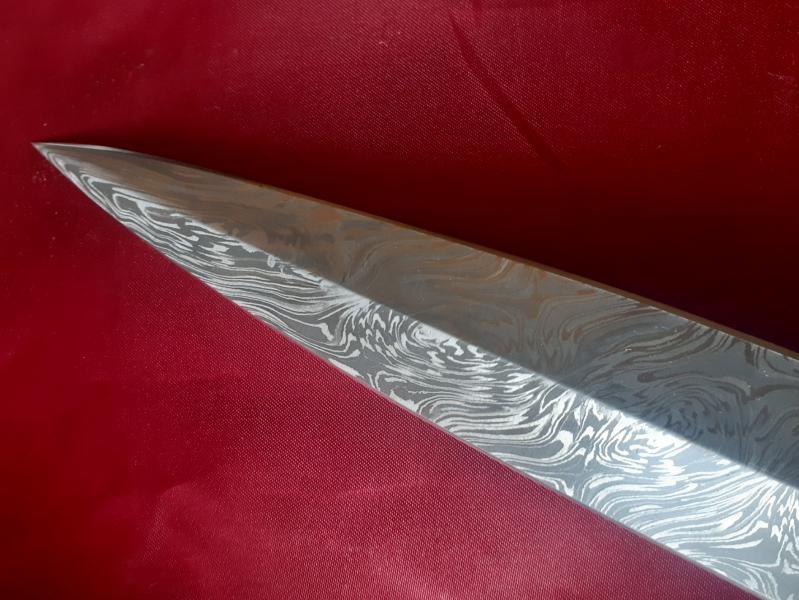 Mas fotos con detalles de la hoja. Por cierto, la guarda también está hecha en el mismo acero de damasco.
