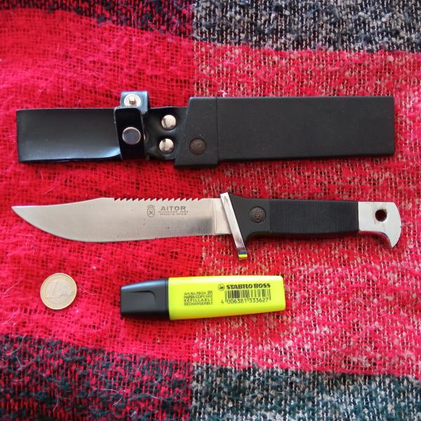 Cuchillo Aitor, años 70, hoja doblemente aserrada incluyendo funda completa y piedra de afilar, todo ello en buen estado, como puede verse por las fotografías. Ideal coleccionistas.