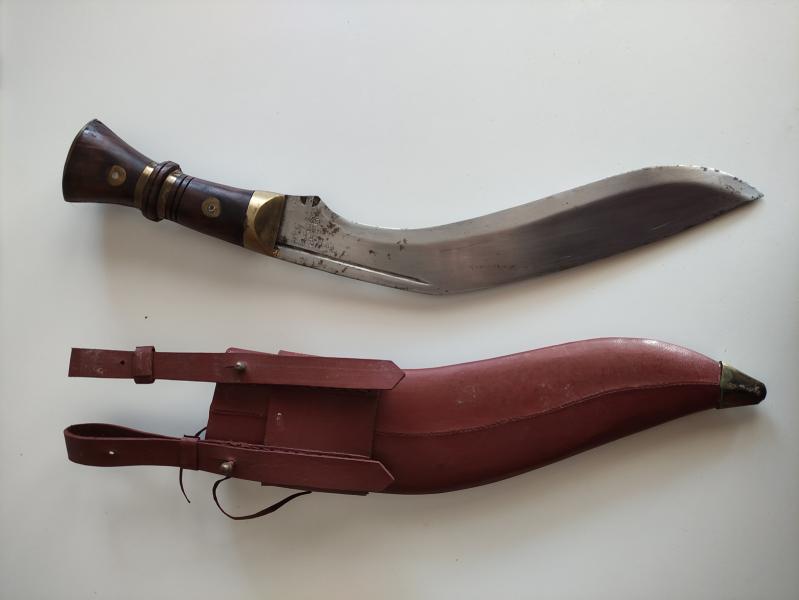 -Kukri de gran tamaño con funda. Alguna marca de óxido en la hoja. 45€.