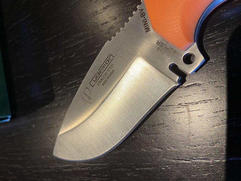 A la venta este mini boina verde en acero Böhler N-695 y cachas en G10 naranja con separadores negros. Funda de piel con cosido también en naranja. Totalmente nuevo, sin ningún uso. No ha cortada ni papel ni salido de la caja más que para las fotos.