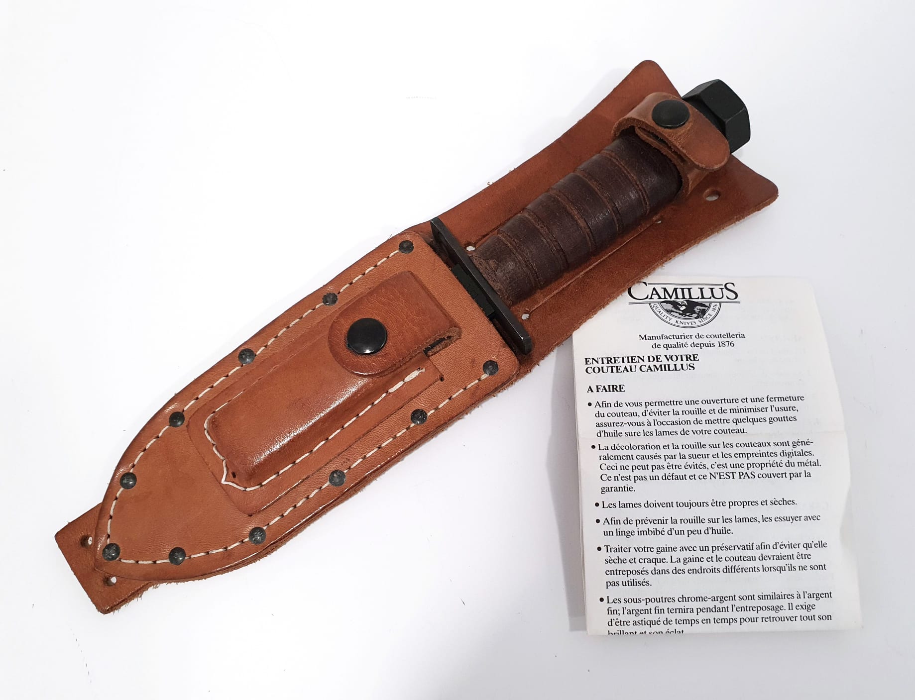 CAMILLUS KNIFE SURVIVAL PILOTS: Cuchillo de supervivencia de combate para pilotos Mod. 5733B. Con funda de cuero y mango de cuero prensado. Pomo de martillo para clavar clavos, hoja de sierra y empuñadura perforada para montaje de lanza. 240€