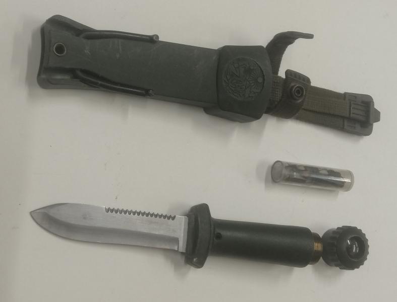 Una pieza icónica del coleccionismo de AITOR, el benjamín de los cuchillos de supervivencia de esta casa. Se encuentra usado, pero en excelente estado, lo único que le falta es la goma del tirachinas que se pudrió por el tiempo transcurrido y lleva hasta el kit de supervivencia de dentro de la empuñadura. Pido 50 euros, rebajado a 45 euros se encuentra en Madrid y puedo enviar por NÁCEX 7 euros. Whatsapp 669403324. VENDIDO