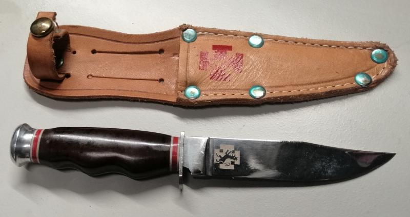 Cuchillo "Flecha" de la O.J.E (Organización Juvenil Española); este modelo fue fabricado por IHER (Izaguirre Hermanos), una de las marcas de Cuchillería del Norte S.L. de Ermua. Se trata de un cuchillo de espiga en Acero Inoxidable, con un largo de hoja de 9 cm. y un largo total de 16,5 cm., en la hoja lleva grabado el escudo de la O.J.E; tiene funda de cuero también con el escudo de la Organización y se trata de un modelo raro al llevar las cachas en marrón en lugar de las habituales negras. Se encuentra como nuevo, son 50 euros entrega en mano en Madrid y se pueden enviar por NÁCEX 7 euros península.
