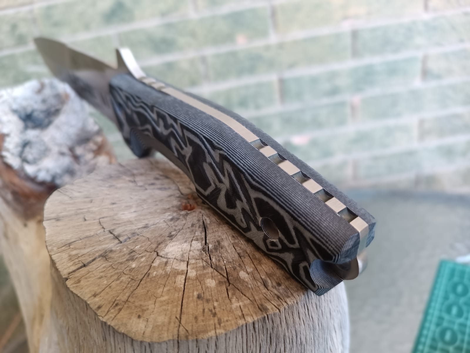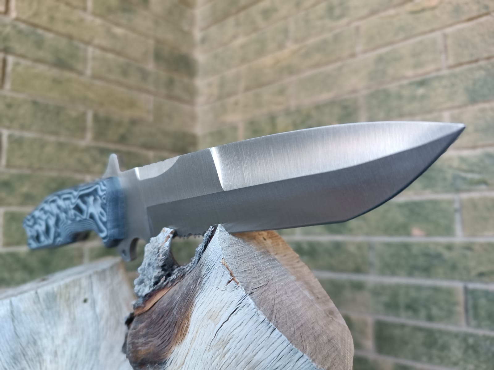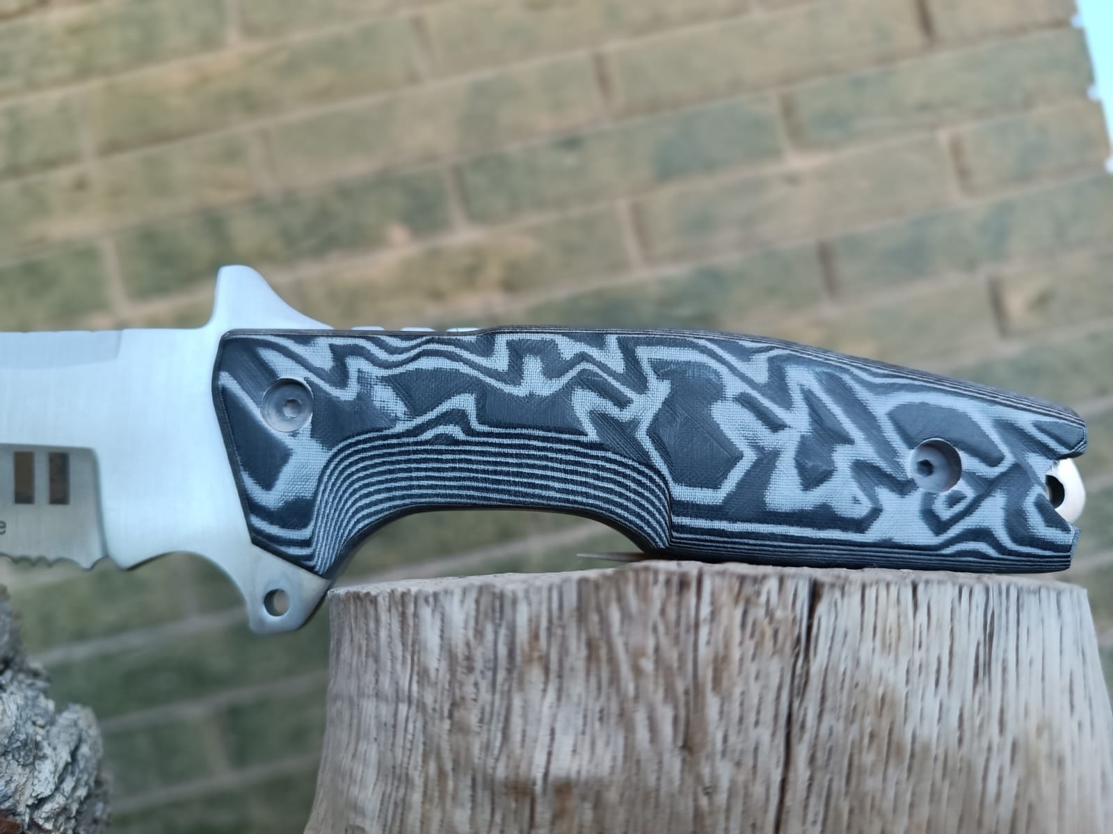Cuchillo español J&V CDA con hoja de acero inoxidable MoVa-58 con acabado satinado y filo parcialmente serrado. Empuñadura con cachas de micarta. Hueco para colocar cordón fiador. Funda de cordura de nylon con bolsillo superior donde alojar complementos de campo.
