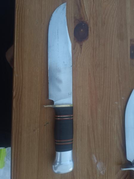 Pues aquí pongo está bestia parda que no tiene otro nombre un cuchillo realizado en 80crv2 con 22 cm de hoja si mango está realizado en cuero y pomo en aluminio mazizo con separadores a mi me encanta los mango de cuero pocos he visto tan bien hecho como esta este con todo respeto a los demás artesanos por supuesto su artesano es J.C.E knives Jordi para los conocidos en fin una pasada su precio lo dejo en 180 envío incluido