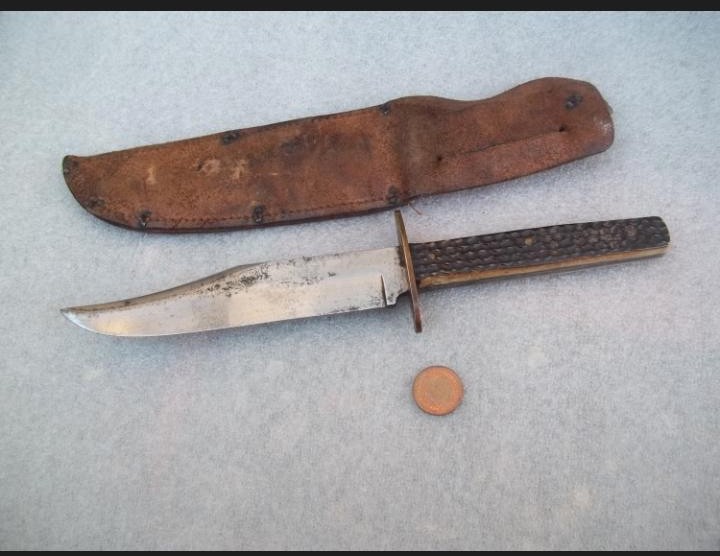 Antiguo cuchillo de caza tipo Bowie 26 centímetros,mango de asta de ciervo, enterizo, bien conservado pero con algunas manchas del tiempo, finales del XIX O PRINCIPIOS DE XX, tiene marcajes pero muy difuminados...fabricado en Sheffield probablemente Nowill o por ser SIMILAR un WHITBY SOLINGEN DE ALEMANIA (IDENTICO A ESTE MEDIDAS , ETC...)