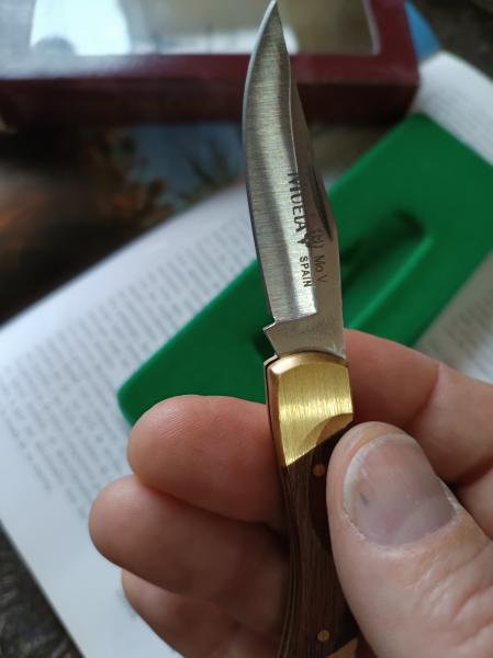 Navaja Muela del cazador Núm.4, modelo 23-M, la pieza más pequeña de la serie cazador y de la factoría manchega. Pieza muy buscada por construcción, medidas y belleza. Descatalogada hace años y extinguida del mercado. Longitud total 13 cm, longitud hoja 5,5 cm, provista de bloqueo trasero Back-Lock, y con un peso ridículo, nueva a estrenar perteneciente a colección particular.