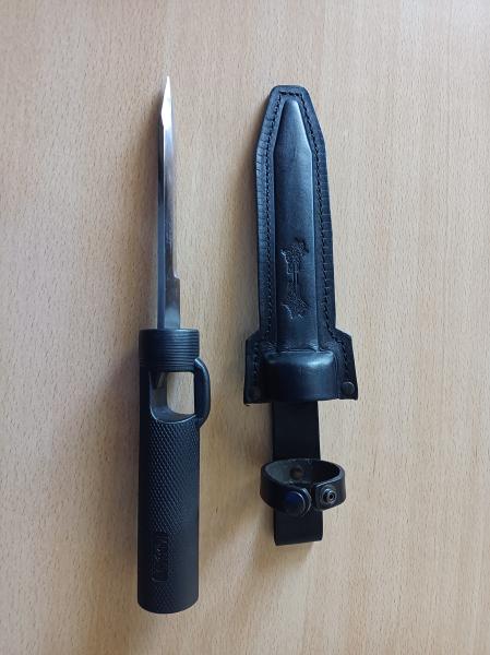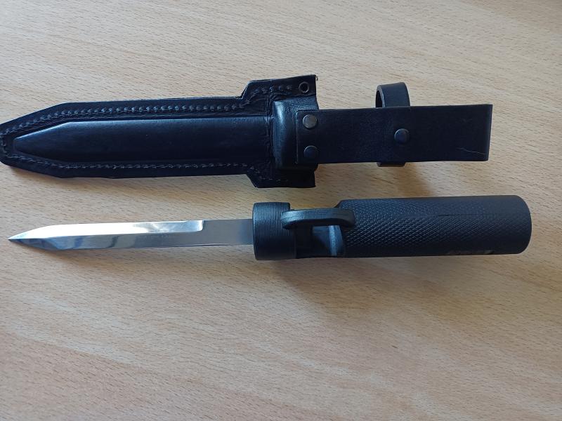 Uno de ellos cayó en mis manos, buen aporte a la colección, pero como estoy cambiándola y limitándome a cuchillos militares (que no bayonetas), este me sobra. Póngolo, pues a la venta, al precio de 100 euros, que creo justo para el material de que se trata.