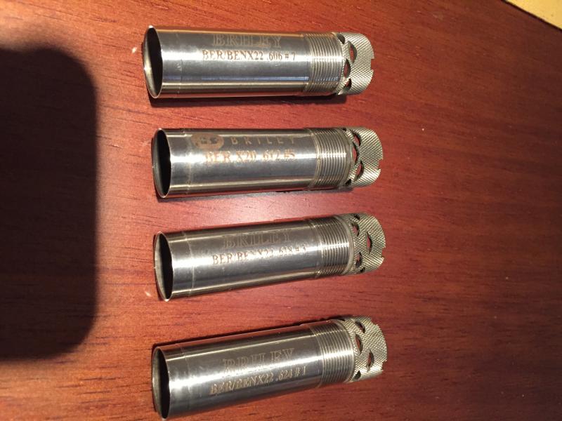 Por venta de arma, vendo cuatro choques Briley, modelo Extended Ported de 1,3,5 y 7 decimas. Equivalentes a 5,4,3 y2 Estrellas. Muy poco usados. Valido para Beretta Urika I, II ,Stone Coat y Benelli. Se venden los cuatro en conjunto. Precio 180 Euros portes incluidos. (Costaron sobre 400 eu.)