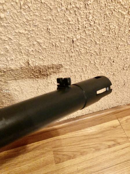 Es el modelo que lleva varias hileras de agujeros en boca para compensar la elevación del arma tras el disparo. Dispone de punto y alza regulable abatible. Pintado en gris oscuro mate por el anterior dueño. Para jabalí me comentó que era una auténtica maravilla. Vendo porque no le doy uso. Precio a concretar por privado con realmente interesados.
