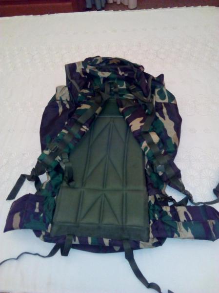 Tiene chasis de hierro,refuerzos en costuras,gran capacidad ,multibolsillos.Espalda acolchada.sujeción en cintura y pectoral.