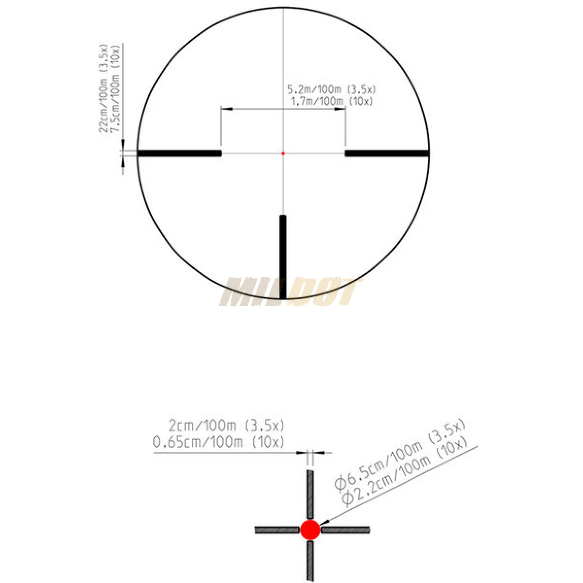 - Campo de visión (100m): 3,5x/11,2m - 10x/4m.